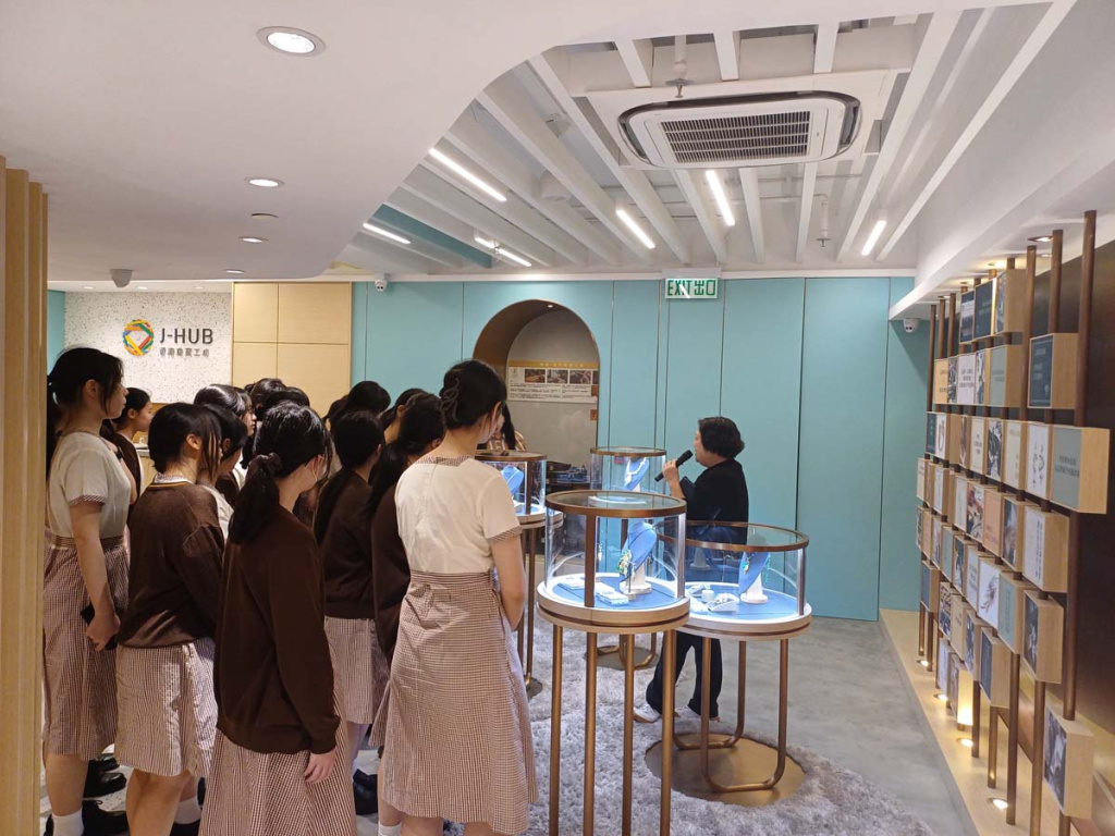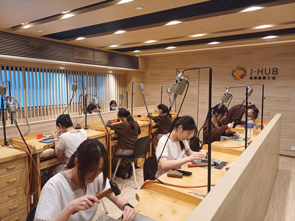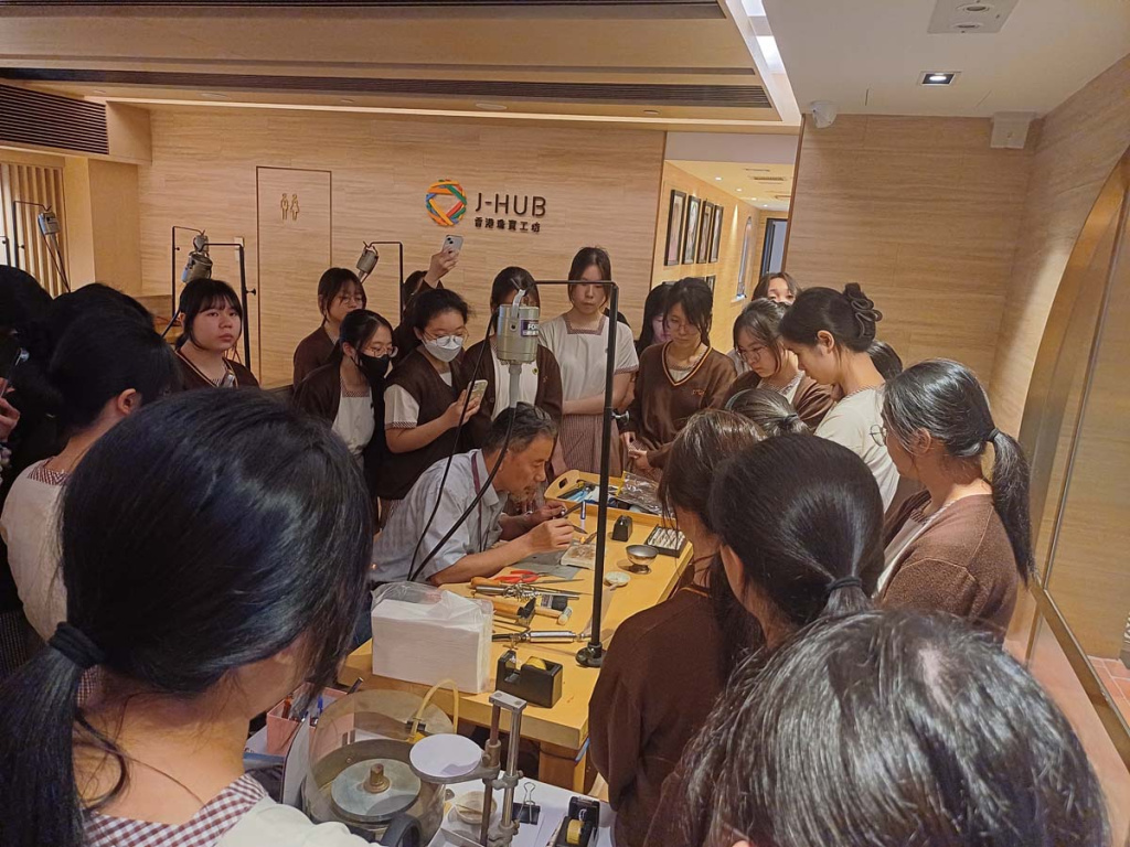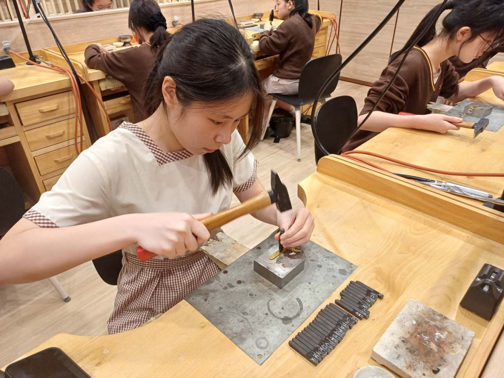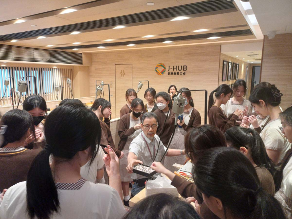 沙田官立中學師生於 4 月 9 日到訪香港珠寶工坊(J-HUB)參與生涯規劃活動。當日邀請到權興珠寶創辦人羅沛權師傅親自示範金工技藝,展示戒指製作的精湛工序;同時由資深珠寶設計師Kimberly Kwok分享珠寶設計的職涯路向,並展示不同階段的設計過程,手稿與作品集。學生更走進工藝室,親手刻製專屬姓名銅牌,沉浸式體驗金工創作樂趣。透過此次互動交流,同學不僅加深對珠寶產業的認識,更激發了對傳統工藝的興趣,為未來升學與職業規劃提供寶貴參考。