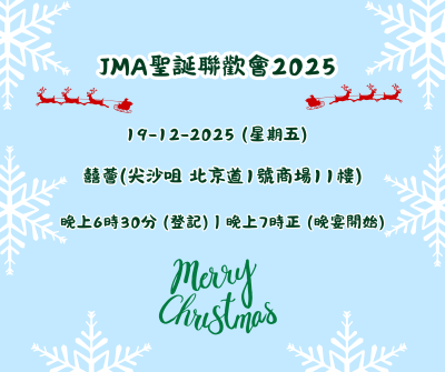 一年一度的JMA聖誕聯歡會將於2025年12月19日(星期五)隆重舉行!今年我們仍然選址尖沙咀,讓您在一片璀璨的聖誕氣氛中,飽覽世界聞名的維港美景。屆時,我們將為您準備豐富的美食盛宴、一連串緊張有趣的互動遊戲,以及驚喜連連的幸運大抽獎,誠邀您與我們一同盡情狂歡,共度溫馨難忘的聖誕夜晚,滿載歡樂與祝福迎接佳節!有關活動詳情如下: