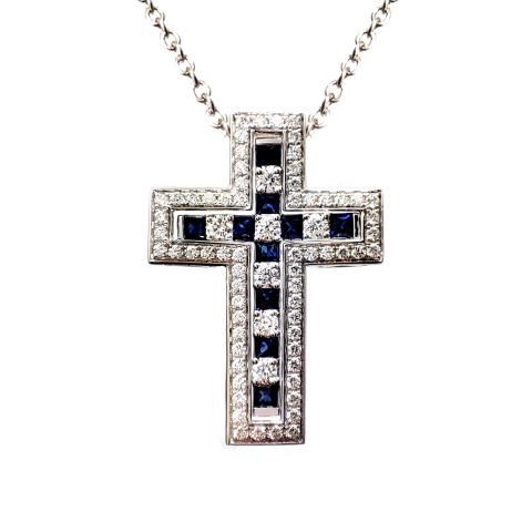 18K White Gold Diamond and Sapphire Cross Pendant with Chain