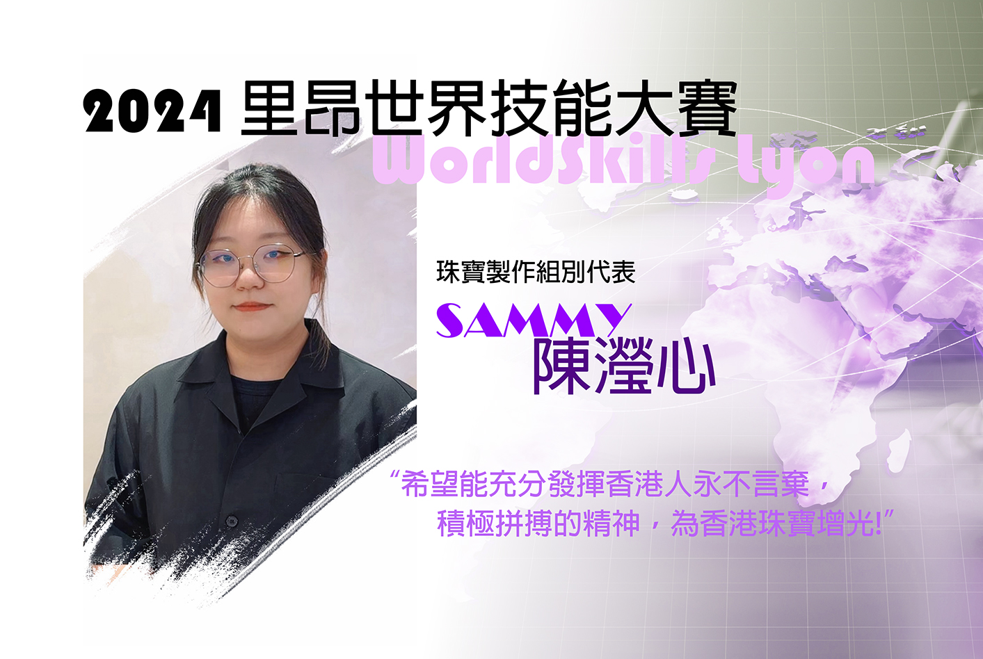 今天「第47届里昂世界技能大赛」正式展开! 被誉为「技能界奥林匹克」将会在2024年9月10至15日期间在法国里昂举行,香港队将派出历来最多的38位选手出战33个比赛项目 。珠宝制作项目代表由香港知专设计学院-珠宝设计及科技高级文凭毕业生陈滢心(Sammy)为香港力争殊荣!