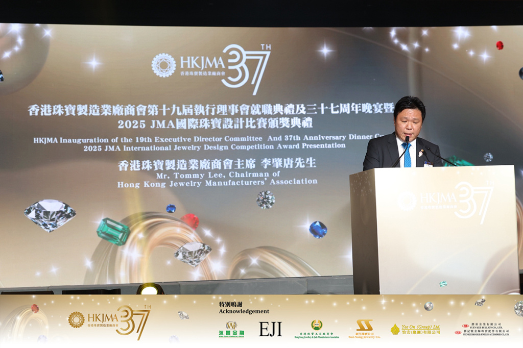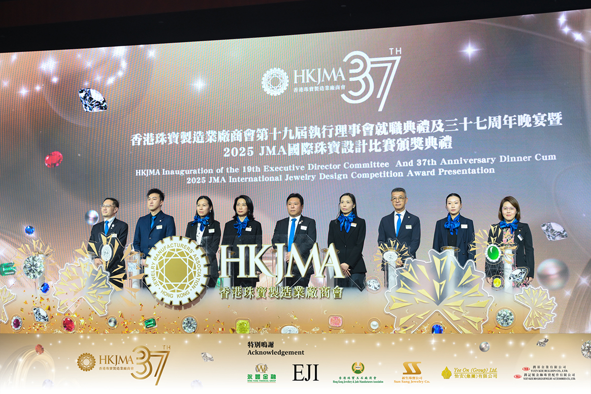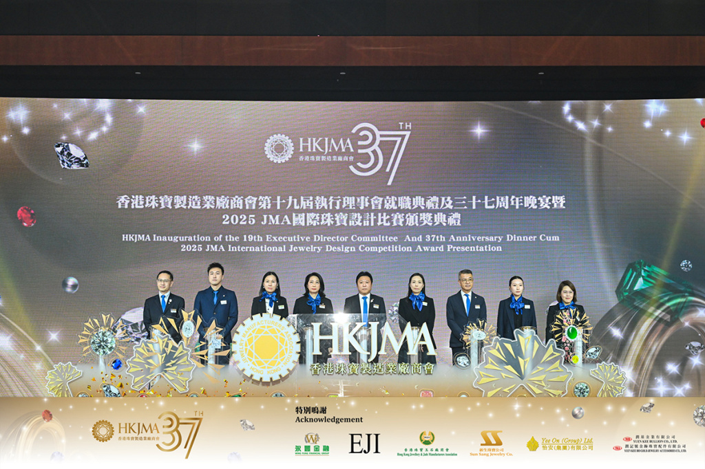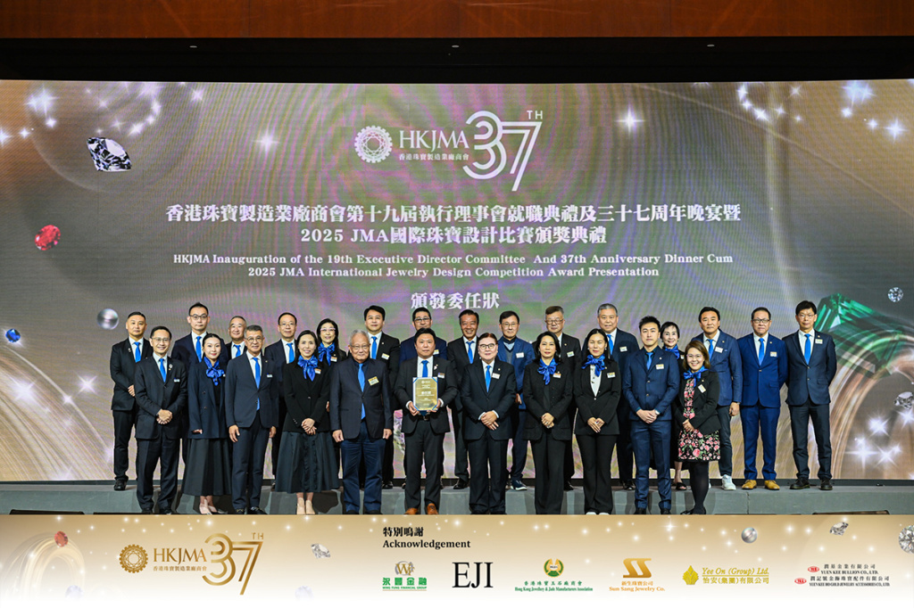 香港珠宝制造业厂商会第十九届执行理事会就职典礼及三十七周年晚宴于11月28日晚假香港会议展览中心会议厅举行,2025-2027年度主席李肇唐先生及各副主席带领著一众执行理事一同上台接受委任状,继续致力带领商会团队为珠宝业界带来优质服务,推动行业发展。